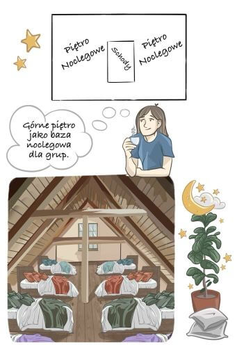 Jak w schronisku młodzieżowym – jeden większy, przytulny pokój do noclegów podczas pobytów wytchnieniowych, warsztatowych, twórczych i wspólnotowych.
